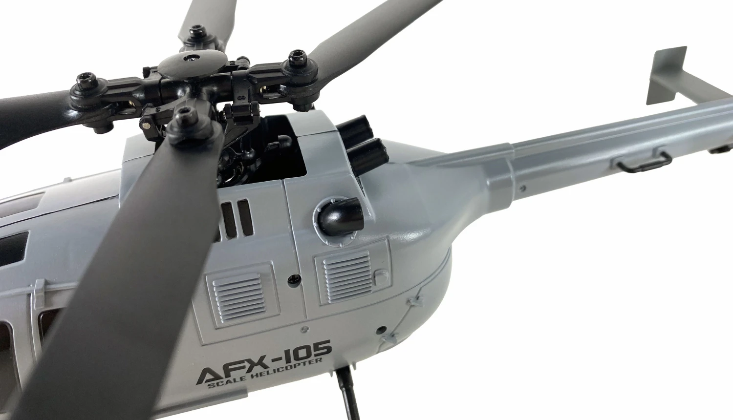 Die AFX-105 ist ein originalgetreuer Nachbau eines der bekanntesten Hubschrauber – der Bölkow Bo 105. Der gesamte Aufbau des Modells ist absolut hochwertig und robust gefertigt und überzeugt durch seine detailgetreue und gute Verarbeitung. Der neu konstruierte 4-Blatt Rotorkopf wird von einem präzisen Stabilisationssystem gesteuert und verleiht dem Modell dank Auto Start und Auto Landing ein völlig neues Steuergefühl! Somit ist es nun auch Einsteigern möglich ein Mehrblatt Helikopter ohne große Vorkenntnisse zu steuern. Über einen Knopfdruck am handlichen 2,4GHz Sender mit Metall Knüppeln lässt sich das Modell ohne Mühe auf eine gewisse Grundhöhe starten. Dort verweilt das Modell (Höhe halten Modus) und der Modellpilot kann sich somit auf die wesentlichen Funktionen des Helis konzentrieren, ohne auf die Höhe achten zu müssen. Das Gyro System steuert dabei zusätzlich im Hintergrund den Heckrotor und hält das Modell stabil in der Luft. Für mehr Agilität im Flug verfügt das Modell über 3 Geschwindigkeitsstufen, welche für Einsteiger und Fortgeschrittene gleichermaßen interessant sind. Somit ist das Modell auch voll Outdoor tauglich (bei leichtem Wind) und erreicht enorme Geschwindigkeiten im Vorwärtsflug. Zum Landen kann der Starten / Landen Knopf am Sender erneut betätigt werden und das Modell sinkt sanft zu Boden. Der Motor verfügt über Softanlauf und Soft Cut. Das bedeutet, beim Start dreht der Rotor langsam an und verhindert dadurch ein Wegdrehen des Modells um die eigene Achse. Dasselbe gilt bei der Landung, der Rotor läuft sanft aus und der Motor wird automatisch abgeschaltet. Als zusätzliches Sicherheitsfeature verfügt der Heli über eine Spannungsüberwachung, die den Akku im Flug permanent prüft. Ist die Grundspannung erreicht, fängt die LED im Heli an zu blinken und signalisiert damit, die Landung möglichst zeitnah anzustreben. Wenn der Pilot nicht reagiert, landet das System den Helikopter selbstständig, um den Akku zu schützen.
