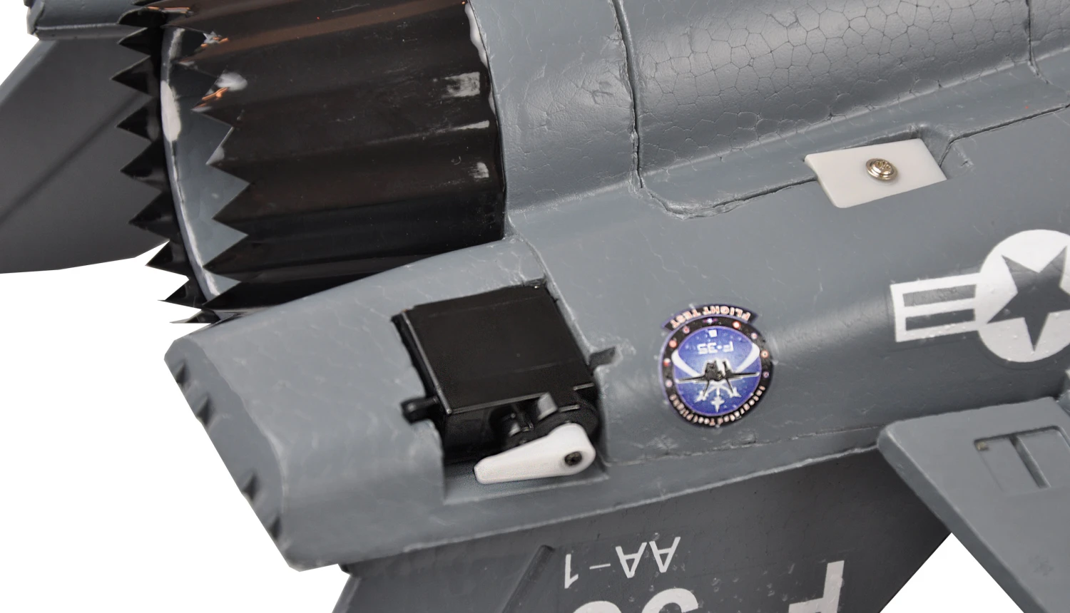 Die AMXFlight F-35 ist ein Scale Nachbau in der PNP-Ausführung (Plug and Play). Das Modell ist weitestgehend vorgefertigt – der Zusammenbau beschränkt sich lediglich auf das Montieren der Tragfläche, der Anlenkungen und des Leitwerks. So sind alle Servos (2x 9g), der 50mm 11-Blatt Impeller inkl. 4900KV Brushless-Motor und der 30A Hobbywing ESC bereits fertig eingebaut.