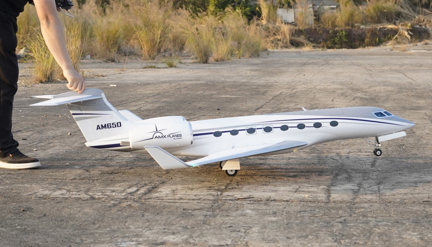 Der AM650 Business Jet hat ein Abfluggewicht von ca. 4kg, abhängig vom verwendeten LiPo-Akku (5000-6000mAh empfohlen) und kann eine Flugzeit von 5-8 Minuten erreichen, abhängig vom Flugstil und verwendeten Akku. Das mitgelieferte AFSS-System kann für noch angenehmere und einfachere Flüge sorgen, indem es z.B. Einflüsse wie Wind etc. ausgleicht.