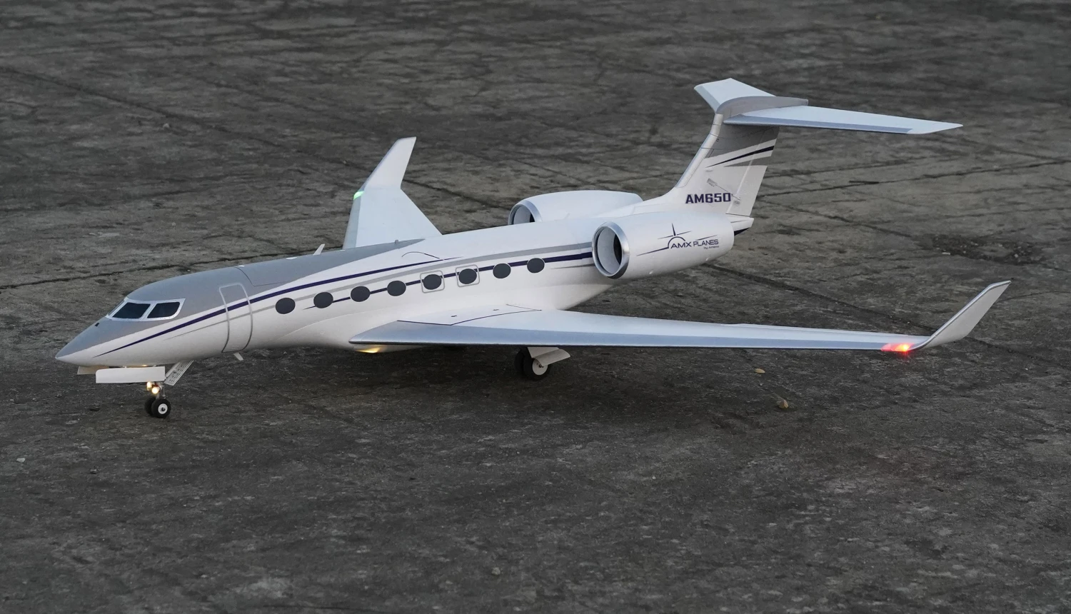 Wir präsentieren unseren ersten Business Jet, den AM650 Twin 70mm EDF Jet. Dieser maßstabsgetreue Nachbau glänzt nicht nur mit seinen schönen Details wie genietete Fensterrahmen, über 13 LEDs, abnehmbare Winglets, ein maßstabsgetreues Fahrwerk mit Fahrwerksklappen und abnehmbare Gondeln, auch die technische Ausstattung wie die beiden 60A Regler von Hobbywing, beide 2860 2200KV Brushless Motoren, die 8 digital Servos mit Metallgetriebe, beide 70mm 12-Blatt Impeller, das 3-Achsen Stabilisierungssystem mit SBUS Funktionalität und voll einstellbarer Verstärkung, die abnehmbaren Tragflächen mit Metall-Flügelverbinden, das geschleppte Hauptfahrwerk sowie das Druckstreben-Bugfahrwerk, sprechen für sich.