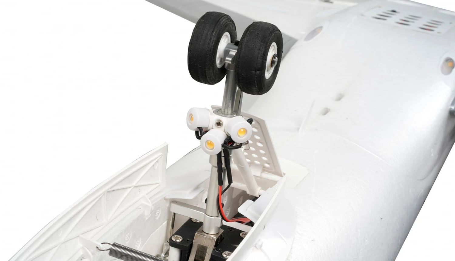 Das Fahrwerk ist elektrisch, aus Aluminium gefertigt, doppelt bereift und geschleppt. Unebenheiten beim Start und etwas härtere Landungen stellen aus diesem Grund kein Problem dar. Dank der üppigen Leistung der feingewuchteten 70mm 12-Blatt-Impeller und der Hochleistungs-Brushless-Motoren mit einer spezifischen Drehzahl von 2200KV an 6S gelingen Starts auch auf Gras bereits nach einer kurzen Startstrecke.
