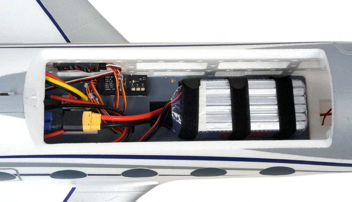 Der Aufbau dieses weitestgehend vorgefertigten PNP-Modells beschränkt sich lediglich auf das Kleben des zweiteiligen Rumpfes, das Anbringen des Höhenruders, der Antriebsgondeln und der Tragflächen. Alle Teile werden geschraubt (bis auf die Rumpfhälften) und alle Kabel, die 13-teilige LED-Beleuchtung, das Fahrwerk und die Verteilerplatine, auf der alle elektrischen Komponenten zusammenlaufen, sind bereits im Modell verbaut. Der Anschluss von Servos und LEDs im Höhenruder und den Tragflächen werden jeweils über einen mehrpoligen Stecker mit dem Gegenstück im Rumpf verbunden, bevor Höhenruder und Tragflächen angeschraubt werden. So werden alle Verbindungen zum Höhenruder mit Heckblitzer und bei den Tragflächen zum Querruder, den Landeklappen, der Beleuchtung und dem Fahrwerk hergestellt.