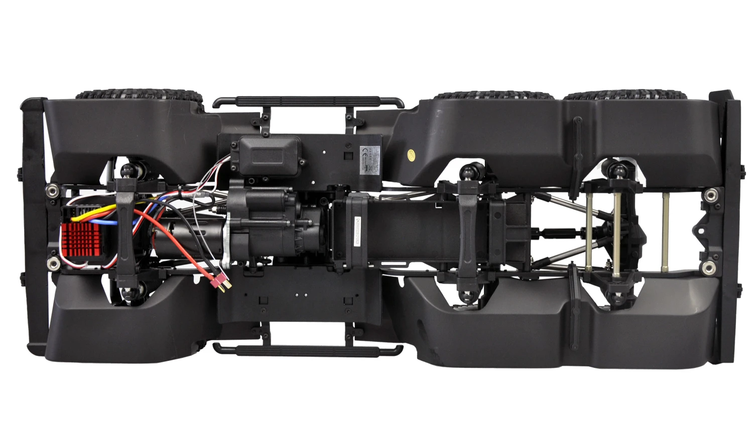 Die im Lieferumfang enthaltene 2,4GHz 4-Kanal Fernsteuerung steuert alle Fahrfunktionen. Das Lenkservo leistet in der Basis-Version bereits 15kg Stellkraft. Das gesamte Modell ist wassergeschützt und trotzt so allen äußeren Einsatzbedingungen.