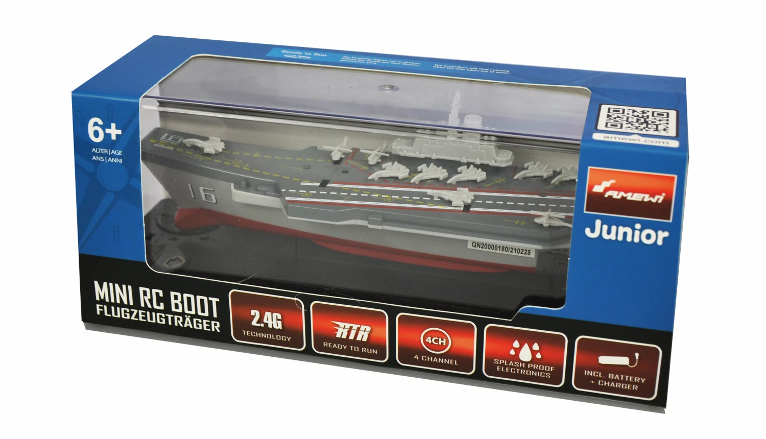 Kleiner RC-Flugzeugträger, der sich sehr agil durchs Wasser bewegt und mit seinem Detailgrad auch optisch überzeugt. Ob in der eigenen Badewanne, im Pool oder Gartenteich – mit diesem ferngesteuerten Spielzeugboot machen die Einsätze auf „hoher See“ besonders Spaß. So lässt sich dieses Marine-Schiff mit spritzwassergeschützter Elektronik antriebsstark bei gleichzeitig stabiler Wasserlage über den „heimischen Ozean“ manövrieren. Neben den Fahrfunktionen vor/zurück/rechts/links bietet das Modell sogar die Möglichkeit zur 360°-Rotation auf der Stelle. Mit großem Schiffsturm, drei Hubschraubern und sieben Jets auf dem Deck sowie der eingezeichneten Start- und Landebahn ist auch fürs Auge einiges geboten und zu entdecken.