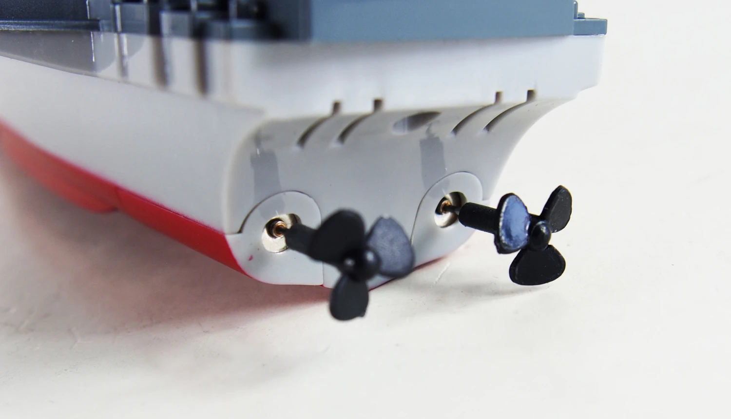 Geliefert in einer stabilen Aufstellbox mit transparenter Haube können die Fernsteuerung und das Boot dank raffiniertem Schiebesystem einfach aus ihrer Verankerung gedrückt und später genauso leicht wieder zusammengesetzt werden. Ins Wasser gesetzt, schaltet sich die Stromversorgung des Modells automatisch ein – aus dem Wasser genommen, hören die beiden Schiffspropeller durch einen Safe-Mechanismus sofort auf sich zu drehen. Das störungssichere 2,4GHz System sorgt insgesamt für ungetrübten Spielspaß. Mit dem fest verbauten Akku, der sich per USB-Kabel laden lässt, sind Fahrzeiten von etwa 6-8 Minuten am Stück möglich. Als RTR-Version (Ready-to-Run) ist im Lieferumfang bereits alles enthalten, was für den Betrieb des Modells notwendig ist. Lediglich die 2x 1,5V AAA Micro Batterien für den Sender sind noch zu besorgen.