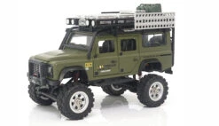 Der D90X28 Metall Scale Crawler im Maßstab 1:28 ist ein Must-have für jeden Scale-Fan, der drinnen wie draußen feinfühlig über kleinere Hindernisse im Parcours balancieren will. Die komplette Karosserie ist aus Metall gefertigt. Dank LED-Beleuchtungsanlage mit Fahrlicht, Rückleuchten, Blinker und Rückfahrlicht macht der D90X28 vor allem in der Dämmerung eine bestechende Figur. Die gesamte Optik, welche mittels beiliegendem Dekorbogen erweitert werden kann, ist ein absoluter Eyecatcher. Alle Türen, die Heckklappe (als Akkufach) sowie die Motorhaube mit Motorattrappe lassen sich öffnen. Der Innenraum ist detailliert ausgestattet mit z.B. Sitzen, Lenkrad und Schalthebel. Für den bereits fertig angebauten Dachgepäckträger liegen Zubehörteile wie Reservekanister, erste Hilfe Boxen oder Traktionsbleche bei.
