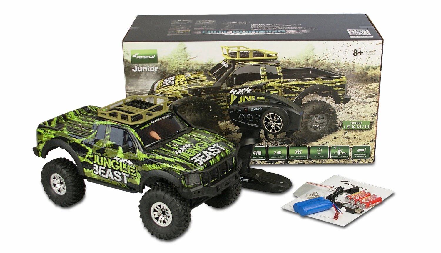 Coole Cross Country Optik trifft auf modernste Features. Dank kräftigem Motor, dem 4WD Allradantrieb und den Oversized-Reifen findet dieser Climbing SUV im Maßstab 1:10 immer seinen Weg aus der Wildnis. Bei Dämmerung hilft zusätzlich die helle LED-Beleuchtung, um jederzeit die Orientierung im Gelände zu wahren. Während die schwarz getönten Scheiben perfekt zum wilden Aussehen passen, lassen sich auf dem Dachgepäckträger dieses Crawlers zudem kleinere Dinge transportieren – ein großes Vergnügen für jeden RC-Piloten. Der Kunststoffrahmen des Fahrzeugs wurde so konzipiert, dass er wirkungsvoll Kollisionen abfedert. Kugellager aus Metall, eine vor Spritzwasser geschützte Elektronik und Stoßdämpfer mit echten Metallfedern unterstreichen den wertigen Eindruck des Modells. Durch eine gut in der Hand liegende und feinfühlige Pistolenfernsteuerung mit moderner 2,4GHz Funktechnologie ist gleichzeitig für eine störungssichere Fahrt gesorgt und auch der parallele Einsatz mehrerer Fahrzeuge aus dieser Serie kein Problem. Der Dirt Climbing SUV wird RTR (Ready-to-Run) ausgeliefert, d.h. alle für den Betrieb benötigten Komponenten – selbst die Batterien für die Fernsteuerung – sind bereits im Lieferumfang enthalten.