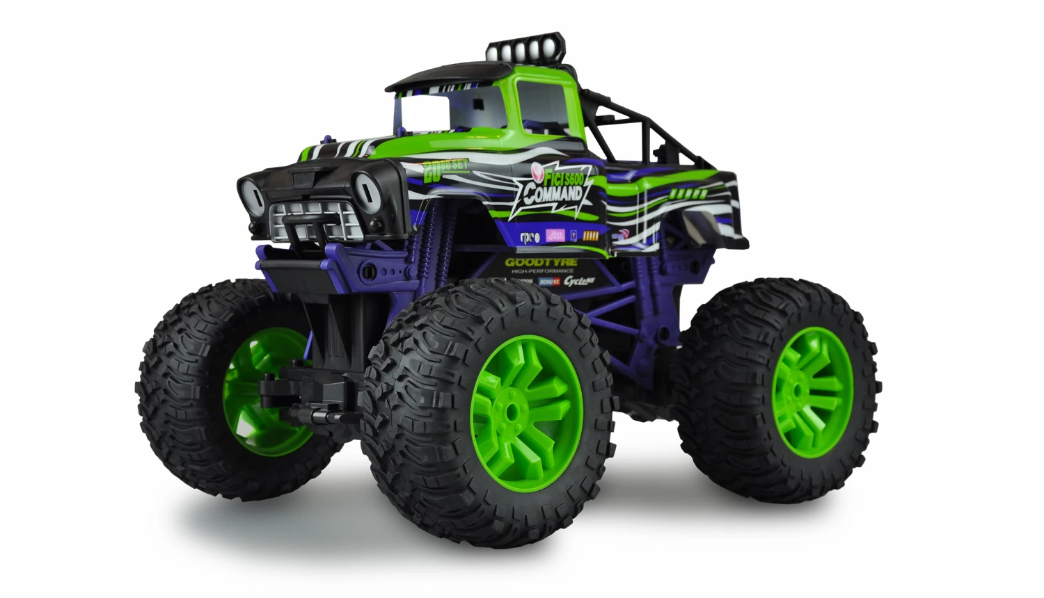 Ein Monstertruck, der den Namen auch verdient. Riesige Gummiräder, eine monströse Karosserie gepaart mit einer hochwertigen Elektronik und einem Spritzwasserschutz. Das sind nur einige Argumente, die dieses tolle Modell voll outdoor- und einsteigertauglich machen. Dank des kräftigen 2WD Antriebes macht das Modell auch im leichten Gelände eine gute Figur. Die erreichbare Geschwindigkeit liegt bei ca. 15 km/h. Das Gas ist voll proportional steuerbar und im Lieferumfang ist der Akku (Li-Ion 7,4V 1200mAh), der 2,4Ghz Sender und ein USB Ladekabel bereits enthalten. Somit ist das Modell nach dem laden des Antriebsakkus und dem einlegen der Batterien im Sender sofort einsatzbereit. (Batterien für Sender nicht enthalten, 2 x 1,5V Mignon AA)