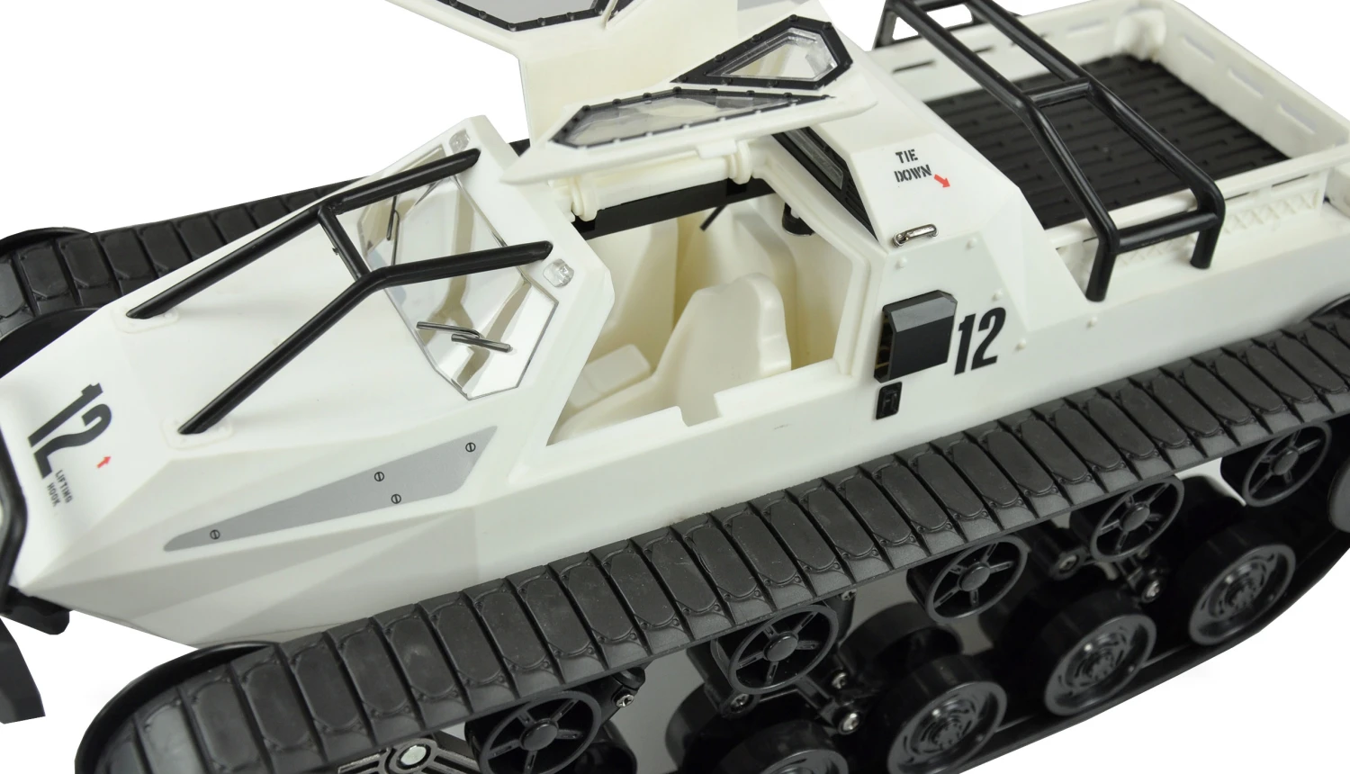 Extrem geländefähiges und futuristisches Kettenfahrzeug mit reichlich Leistung. Das Kettenfahrwerk ist gefedert und die Ketten sind aus Gummi. Somit hat das Modell auf jedem Untergrund genügend Grip. Selbst Wheelis sind problemlos möglich und der Spaß „outdoor“ ist fast grenzenlos. Die erreichbare Geschwindigkeit ist ausreichend um wirklich Spaß zu haben und das Gas ist vollproportional steuerbar. Zusätzlich hat das Modell eine LED Lichtleiste auf dem Dach, was auch Fahrten in der Dämmerung zu einem Erlebnis der besonderen Art macht. Aufgrund des Spritzwasserschutzes ist das Modell uneingeschränkt geländefähig und der mitgelieferte 1200mAh Li-Ion Akku sorgt für ausreichende Fahrzeit. Das ebenfalls enthaltene Balancer Ladekabel (USB) rundet das Paket in Verbindung mit dem störungsfreien 2,4GHz Steuersystem ab. Zudem sind die Flügeltüren am Modell bedienbar (öffnen / schließen) was den Scale Charakter des Modells erhöht. Weiter verfügt das Modell über eine Antriebsbox mit Doppel Planetengetriebe, eine Führungsrad-Halterung aus Metall und eine selbsteinstellende Spurweitenregulierung der Vorderräder (dieses verhindert ein Abspringen der Ketten), das Fahrwerk ist komplett gefedert.