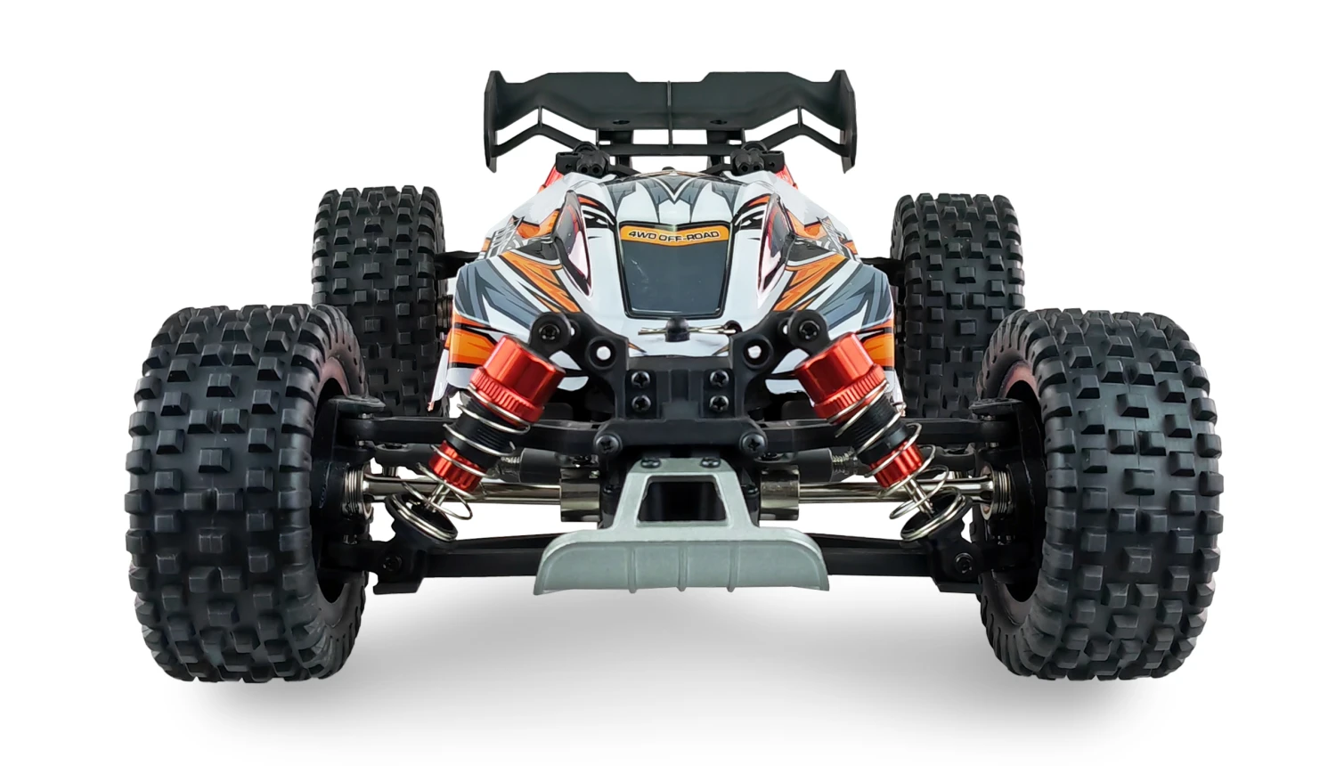 Das Chassis sowie Querlenker und Dämpferbrücken sind aus Composite-Kunststoff gefertigt. Ein einstellbares Fahrwerk und die Aluminium-Öldruckdämpfer sorgen für ein direktes Fahrverhalten – voller Kontrolle bei voller Fahrt verleiht. Der Race Buggy ist spritzwassergeschützt und kugelgelagert. Damit ist das Modell uneingeschränkt outdoortauglich, macht auf jedem Untergrund eine gute Figur. Für eine effiziente Kraftübertragung des starken Antriebes an alle vier Räder (4WD) wurde das Fahrzeug zusätzlich mit einem Hauptzahnrad und einem Motorritzel aus Metall ausgestattet. Eine gut in der Hand liegende 2,4GHz Fernsteuerung liegt dem RTR-Set ebenfalls bei.