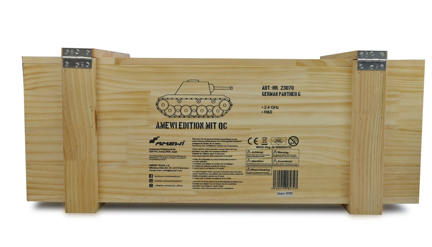 Die Amewi Edition ist ein originalgetreuer Nachbau im Maßstab 1:16, geliefert als RTR Version in einer massiven Echtholzbox im repräsentativen Stil einer naturfarbenen Munitionskiste. Der Panzer verfügt über eine Rauch- und Soundfunktion sowie eine Beleuchtungsanlage für noch überzeugendere Erlebniswelten. Die Schussfunktion erfolgt mittels Steuerknüppel und Drucktaster, über die 6mm BB Hartplastikgeschosse bis zu 15 Meter weit verschossen werden können. Zusätzlich verfügt das Modell über ein Infrarot-Kampfmodul, was Zweikämpfe mit anderen Panzern aus dieser Amewi Edition zulässt. Bei einem direkten Treffer durch einen Gegner wird der getroffene Panzer einmal sichtbar ‚durchgerüttelt‘. Die Kanone lässt sich hoch und runter bewegen, alle Steuerfunktionen sind proportional und damit feinfühlig steuerbar. Angetrieben wird das Modell von zwei starken Motoren, die ihre Kraft über ein mehrstufiges Kunststoffgetriebe an die Antriebsräder übertragen. Dieses originalgetreue Modell mit seiner Camouflage-Lackierung steht dem echten Panzer in nichts nach. Der gesamte Lieferumfang entspricht dem neuesten Stand der Technik (Elektronik TK 7.0). Ab sofort liefern wir alle Modelle mit einem zeitgemäßen Li-Ion Akku mit 1800mAh und 7,4V aus. Ein passendes Ladegerät liegt dem Set ebenfalls bereits bei.