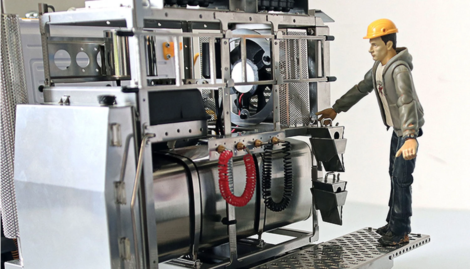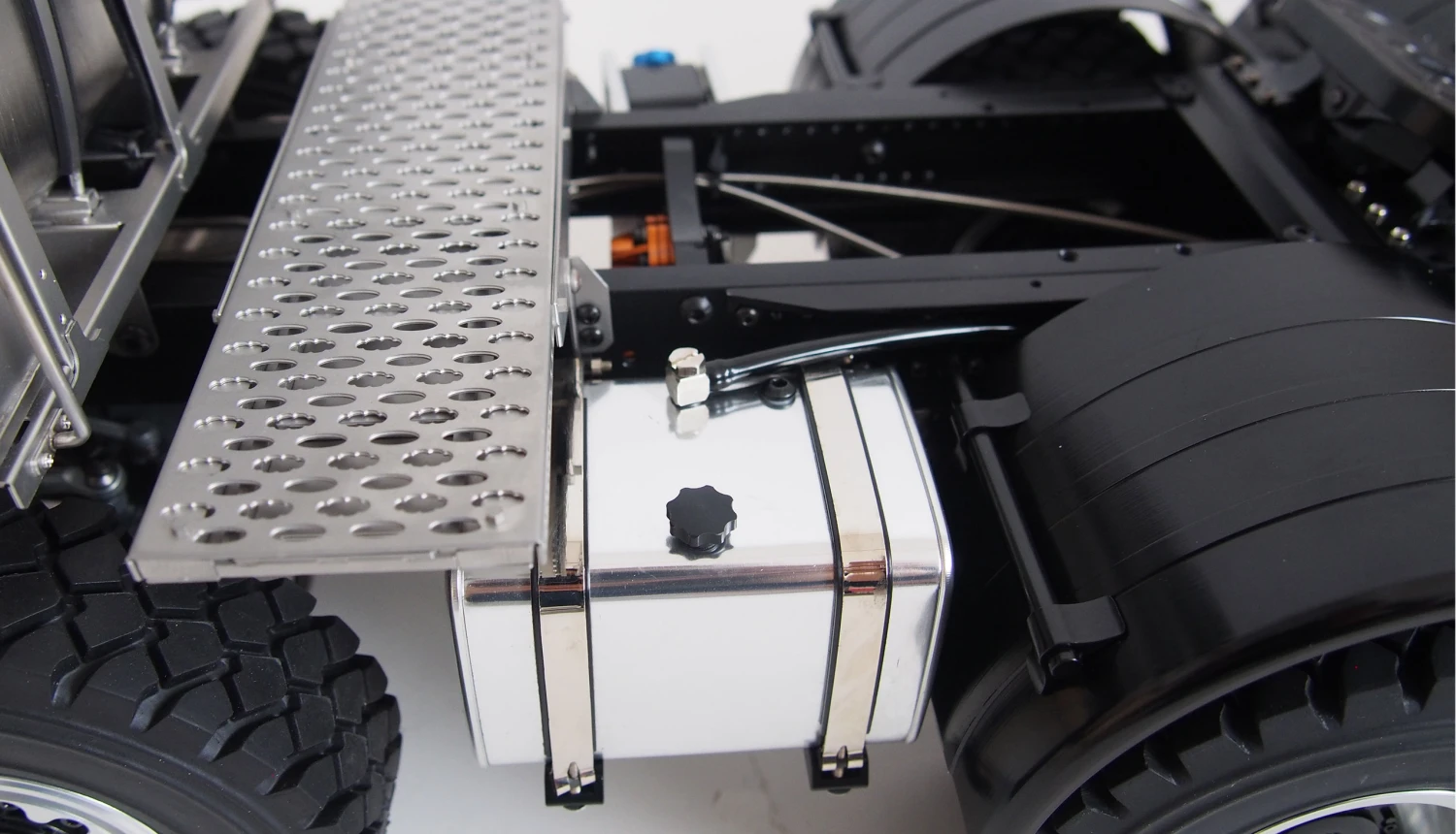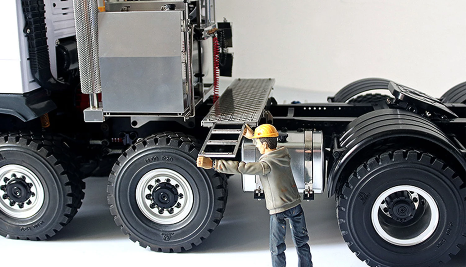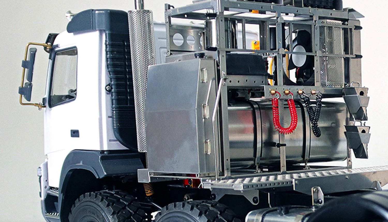 Sehr hochwertiger Scale LKW-Kipper im europäischen Stil (Detaillierte Fahrerkabine aus Kunststoff). Das Chassis, Achsen und Antriebe sind aus hochwertigem Metall hergestellt. Das Modell ist mit einem 2-Gang Getriebe und vom Sender aus schaltbaren Differentialsperren ausgerüstet, welches den Einsatz auch in unwegsamen Geländen problemlos zulässt. Viele Anbauteile wie z.B. der Tank (dieser dient auch als Akkufach) usw. sind ebenfalls aus Aluminium hergestellt.