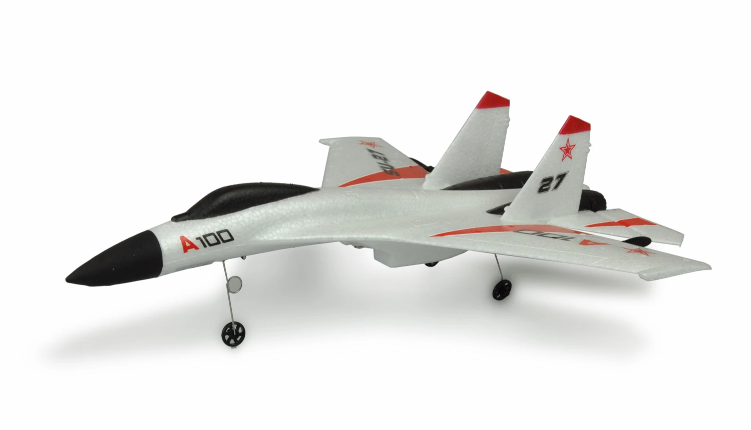 Nachbau des zweistrahligen russischen Kampfjets SU-27. Er ist bis heute eines der wichtigsten Jagdflugzeuge der russischen Luftwaffe und wurde als direktes Gegenstück zur US-amerikanischen F-15 Eagle entwickelt. Das Modell überzeugt durch seine Flugleistungen und der vollautomatischen Lagestabilisierung (Gyro) welches dem Modell sehr angenehme Flugeigenschaften verleiht und es Einsteigertauglich macht. Das Model wird RTF (Ready to fly) ausgeliefert, d. h es ist kein Schrauben, Bohren oder Kleben erforderlich. Der eingebaute Gyro übernimmt sofort die Flugstabilisierung und der Pilot kann sich auf das eigentliche Steuern des Modells konzentrieren. Sobald keine Steuereingabe gemacht wird, geht das Modell wieder in einen horizontalen Geradeausflug. Durch eine Taste am Sender kann der Gyro für z.B. Loopings ausgeschaltet werden (stabilisiert max. 15 – 20° Steigflug möglich). Sollte doch einmal die Fluglage unsicher werden, dient der Gyroschalter als Rettungsanker. Direkt nach dem Drücken des Knopfes wird das Modell wieder automatisch in eine stabile Fluglage gebracht. Das robuste und schlagzähe Material (EPP) lässt auch mal härtere Stürze und Landungen zu. Es ist leicht zu reparieren bzw. zu kleben.