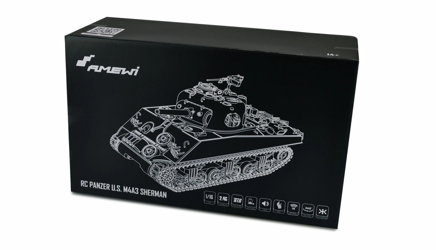 Die Amewi Edition ist ein originalgetreuer Nachbau im Maßstab 1:16, geliefert in einem schönen schwarzen Karton mit passendem Styroporkern als Version RTR – Ready-to-Run. Der Panzer verfügt über eine Rauch- und Soundfunktion sowie eine Beleuchtungsanlage für noch überzeugendere Erlebniswelten. Die Schussfunktion erfolgt mittels Steuerknüppel und Drucktaster, über die 6mm BB Hartplastikgeschosse bis zu 15 Meter weit verschossen werden können. Zusätzlich verfügt das Modell über ein Infrarot-Kampfmodul, was Zweikämpfe mit anderen Panzern aus dieser Amewi Edition zulässt. Bei einem direkten Treffer durch einen Gegner wird der getroffene Panzer einmal sichtbar ‚durchgerüttelt‘. Die Kanone lässt sich hoch und runter bewegen, alle Steuerfunktionen sind proportional und damit feinfühlig steuerbar. Angetrieben wird das Modell von zwei starken Motoren, die ihre Kraft über ein mehrstufiges gekapseltes Metallgetriebe an die Antriebsräder übertragen. Dieses originalgetreue Modell mit seiner dunkelgrünen Lackierung steht dem echten Panzer in nichts nach. Sämtliche Bauteile entsprechen dem neuesten Stand der Technik (Elektronik TK 7.0). Ein zeitgemäßer Li-Ion Akku mit 1800mAh und 7,4V sowie ein passendes Ladegerät liegen dem Set bereits bei. Das Modell wurde vor dem Verpacken auf Funktionalität geprüft und ein Funktionsprotokoll liegt bei.